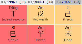 I wonder whether Pig year can help him (by luring away the Goat) or it will make Goat even stronger against the Ox? Not to forget that Pig will also clash his Snake.