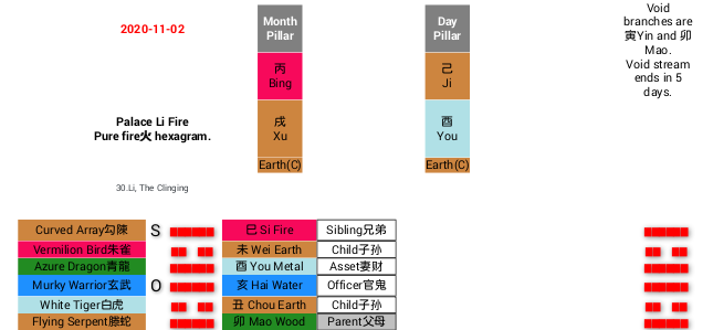 But who knows if the result is the other way round, Tientai. As Raymond observed in the other hexagram on the football match:Quote from: Raymond on October 24, 2020, 04:55:05 AMThe six hexagram clash also tells that the result will be unexpected.Most polls favor Biden, so the result can be that Trump becomes the winner.About hexagram Li (Fire), one of it's properties is the red color --> Trump's color.In this case, we don't need to see the changing hexagram's properties, because there is none.