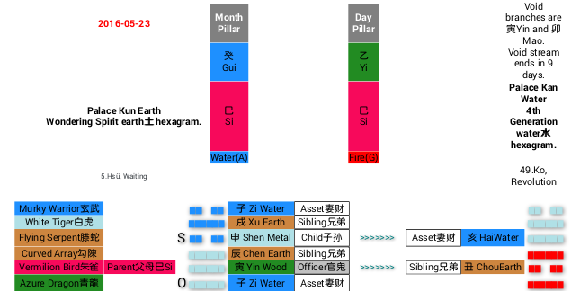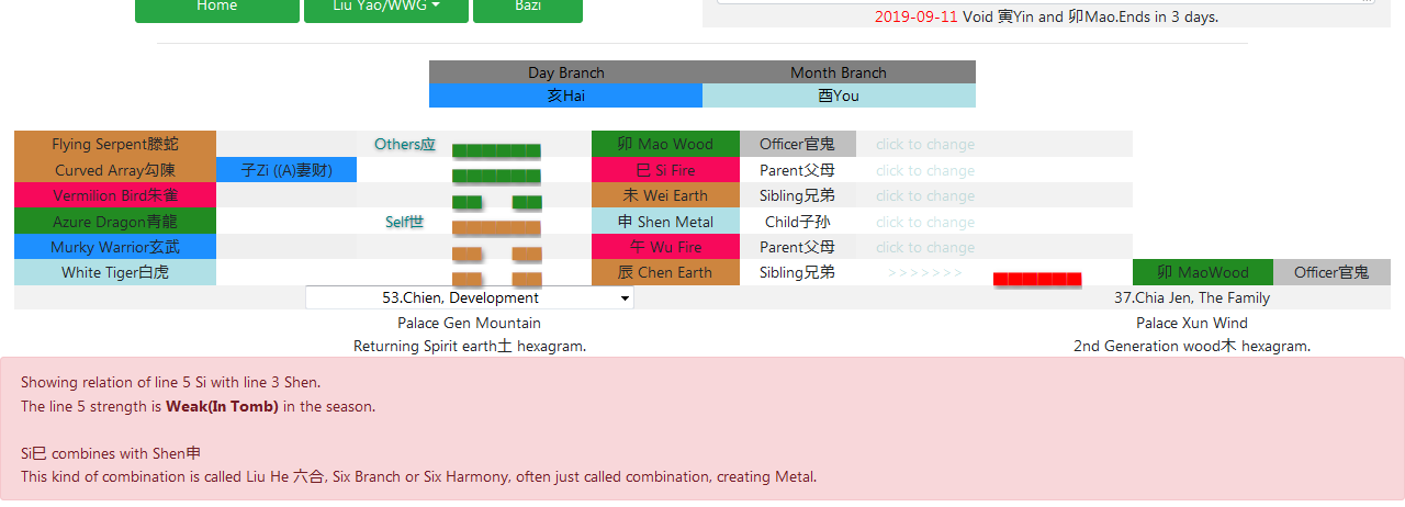 There also happens to be a line within the reading that is undergoing Hidden Movement (暗动); the Annoying God/Spirit of Annoyance (忌神) that is the Parent Line, represented by the Snake atop the Curved Array (勾陈), which subsequently attempts to Combine (合) with the Self Line. The Annoying God may also be viewed from the view of the person themselves (the person asking the question to this Reading about illness) to be an illness in of itself.