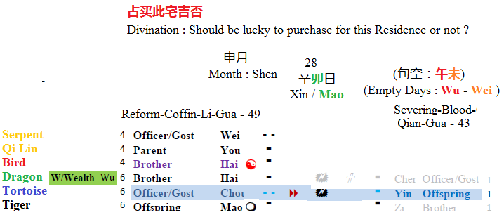 余曰: 此宅宜买,申金月建生世,卯日又冲动父爻生世,人宅相宜,管许必发,但嫌二爻鬼变子孙,须防克子。