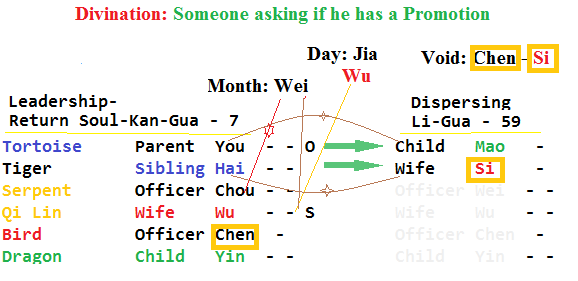 However inside the Hexagram there are two [more ] Officer Stars, One is in Empty days [Kong] the other in [Month ] break [Po], When arriving 【Chen Year】,【Chen - earth】, when the Officer is out of Empty [Kong], certainly will happen the great Turn [Comeback to Promotion].