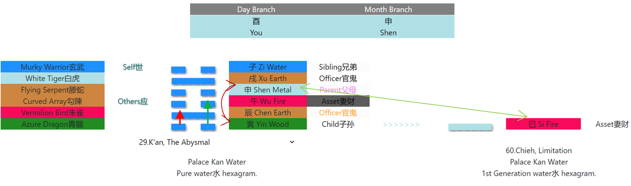 I also seemed to read that more energy is spent on controlling than on generating, therefore a weak line could only generate and not control. As in this case Yin wood is a weak line, and clashed by the Shen month could be considered broken (Po). But imagine it was a strong line in Mao or Yin Month. Could it, this Yin wood line, clash to Shen metal line and also generate Wu fire and also control Chen earth? Or perhaps the Liu He and Chong take priority over the functions of Sheng and Ke?