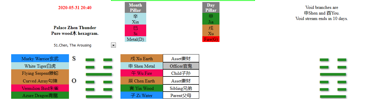 Quote from: Gmuli on June 08, 2020, 07:41:43 PMI thought was suppose to be good(its about eating pizza) yet it turned out to bring problems.Hi Gmuli, in this hexagram, Self and Others line are both equally strong by Month and Day. But the Others (Object) line has hidden movement, as suggested correctly by Tientai below:Quote from: Tientai on June 08, 2020, 07:29:41 PMThe possibility of " movement " in an nonmoving hexagram comes only from the clash by the day branch ..(secret moving line ) Therefore the Others line moves and is somewhat stronger than Self. Others is the object or food that you eat (Wealth line = food). It's stronger so it's difficult for Self to digest. Others line comes with Gou Chen, and Gou Chen in the Six Animal images can represent the digestive system. You can see it as the food "moving" in your digestion. In Liu Yao, certain things are better when it's non-moving, for example the Others Wealth line in this case.Officer line (Illness) does not move, so I don't see that it actually brought an illness. Just a discomfort that's shown by "quiet" Self clashing a moving Others line.
