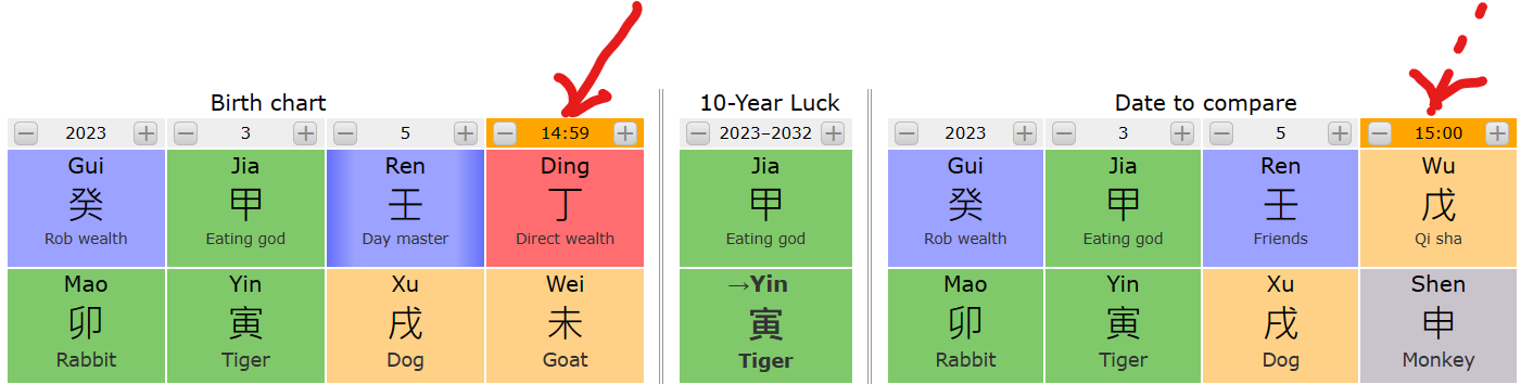 We often encounter Bazi charts at the border between two Chinese hours.  For example: