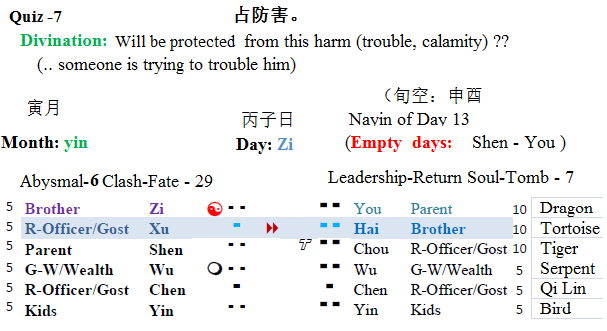 To deal with Yin-day, the 5th Officer/Ghost Xu Earth Original (primary) God is restrained by Yin wood, now is Yin Wood (on month branch), and when wood prosper (wang) the Earth is decline just as rest.