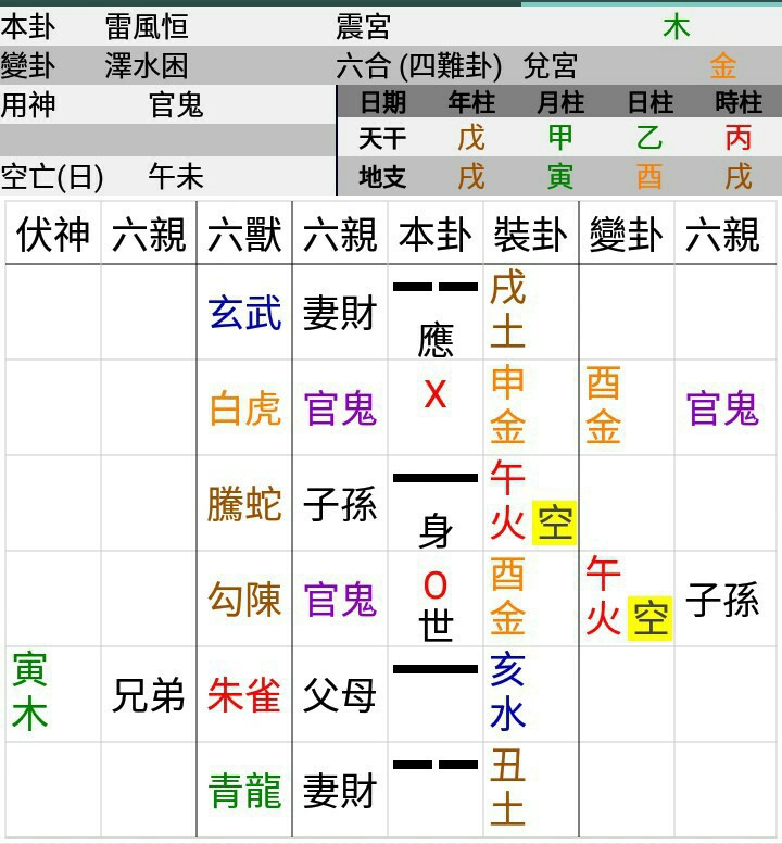 6.  Time of divination.  I cannot see the time on @Gmuli 's software, but I see it on the Chinese app as 19:03.  What time did you start to toss coins?  This is a minor detail for my research.