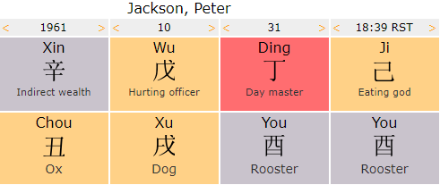 bazi-calculator.comPeter Jackson's chart: in Mangpai, we see it as Output producing Wealth structure. Wu and Ji Stems produce Xin and You. And then as controlling Xu Fire Tomb. And Fire Tomb can represent the various visual (fire) arts, including painting, photography, video, camera, television etc.