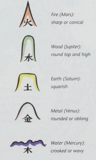 Here is a image from Stephen Skinner's book Feng Shui: The Traditional Oriental Way about mountains and the elements they belong to: