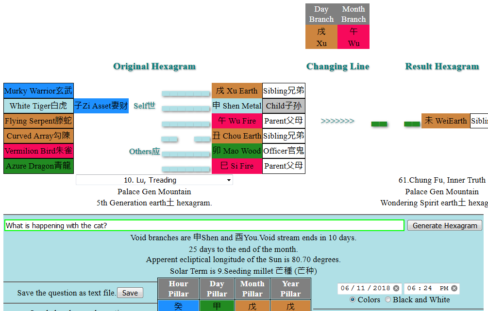 The Offspring line sits in the Self position, together with Zi Wealth.  Zi as hidden line is able to come out (in this case). But then it suffers from Month Break (Wu clashes Zi), which is too bad for the cat & querent.