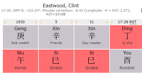 Indeed, look at Clint Eastwood's chart below: all four pillars are unstable.  (Year-Month-Day-Hour)