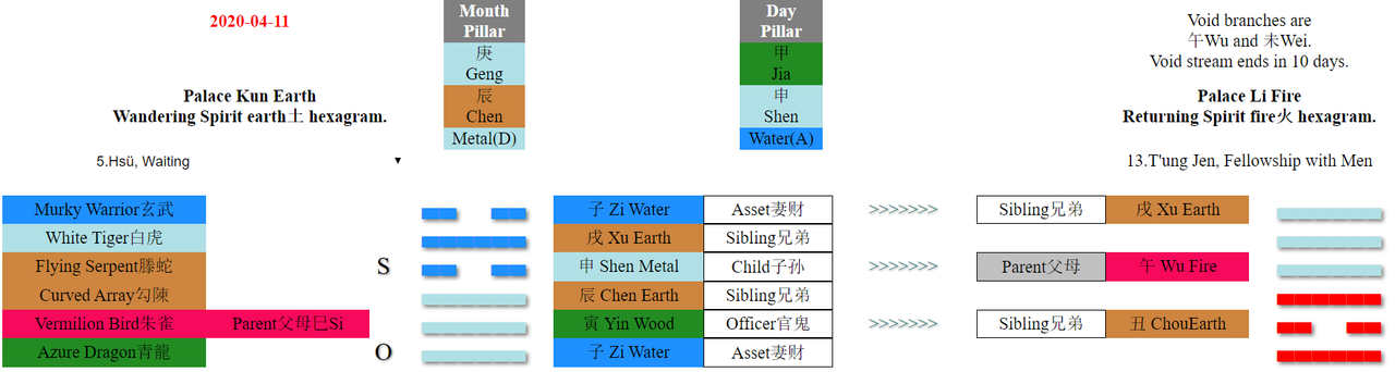 https://www.bright-hall.net/wwg/5,0,1,0,1,0,1,1,6,2020-04-11,01:21It struck me that again there are 2 parents Wu and Si (also Yin Official and Zi Asset, the same). This time Self is sitting in Offsprings (freedom). That Self is sitting in Offsprings, can denote my desire for freedom. Quarantine's been hard on everyone.